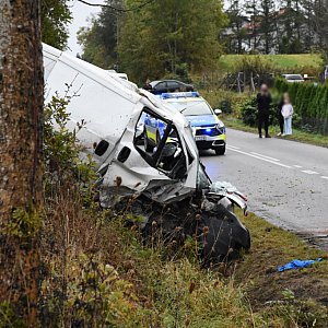 W Szklanej (gm. Sierakowice), na drodze powiatowej doszło do zderzenia dostawczego busa z samochodem osobowym.