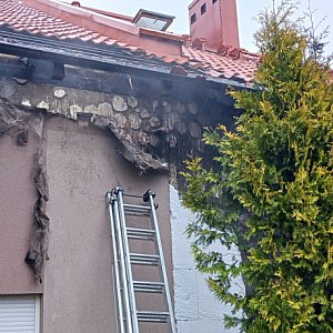Strażacy otrzymali zgłoszenie o pożarze poddasza w budynku typu bliźniak o godz. 13:06. Gdy dojechali na miejsce zdarzenia stwierdzono, że ogniem objęty jest parter oraz poddasze budynku.