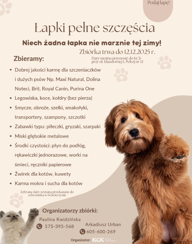 Kartuskie Centrum Kultury w Kartuzach zaprasza mieszkańców do udziału w akcji „Łapki pełne szczęścia”, corocznej zbiórce na rzecz Schroniska dla Zwierząt w Kościerzynie. Potrzebne rzeczy można przynosić do 12 grudnia.