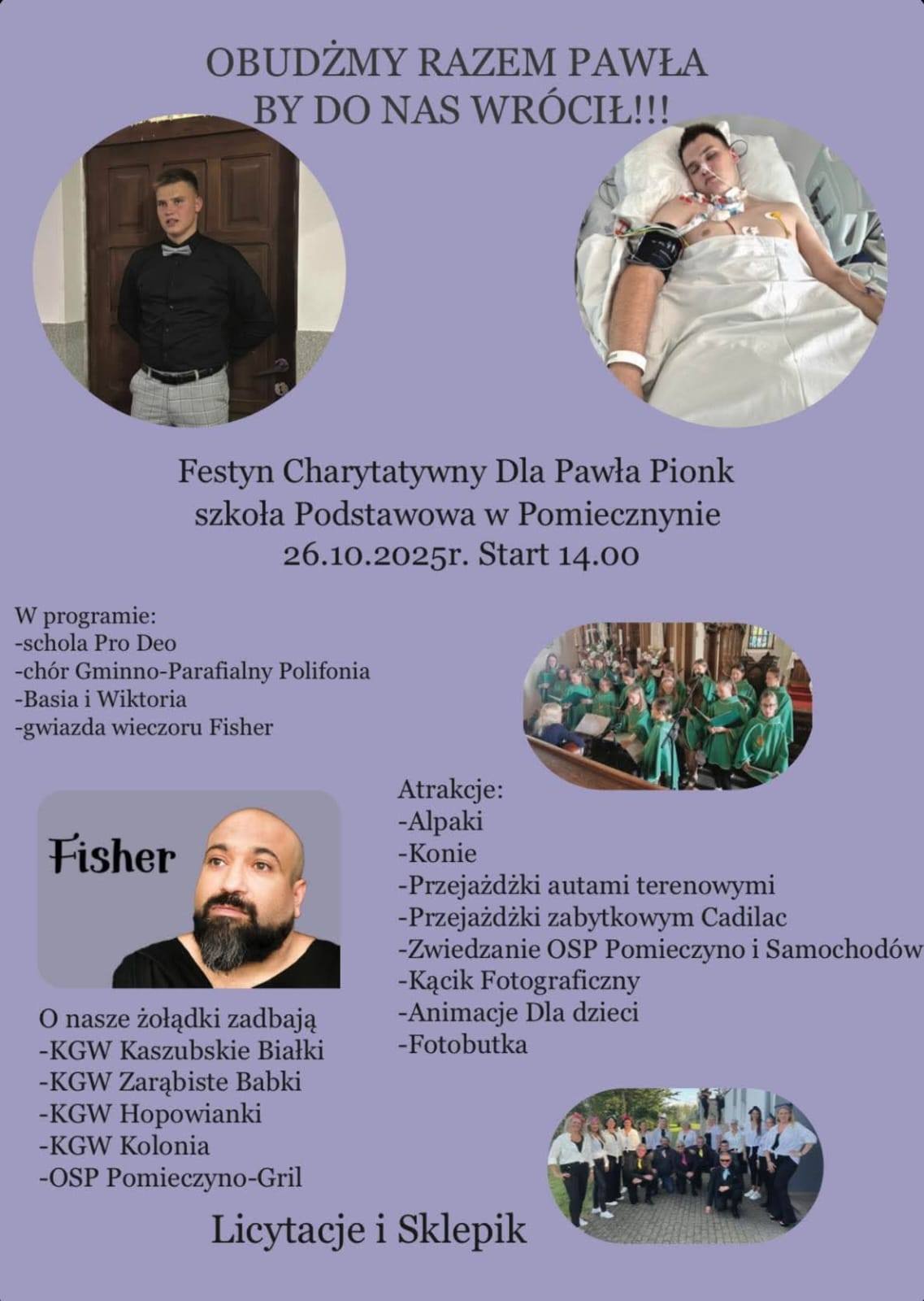 W niedzielę 26 października w szkole w Pomieczynie (gm. Przodkowo) odbędzie się festyn charytatywny dla Pawła Pionka. W sierpniu uległ wypadkowi drogowemu. Od tego czasu pozostaje w śpiączce.