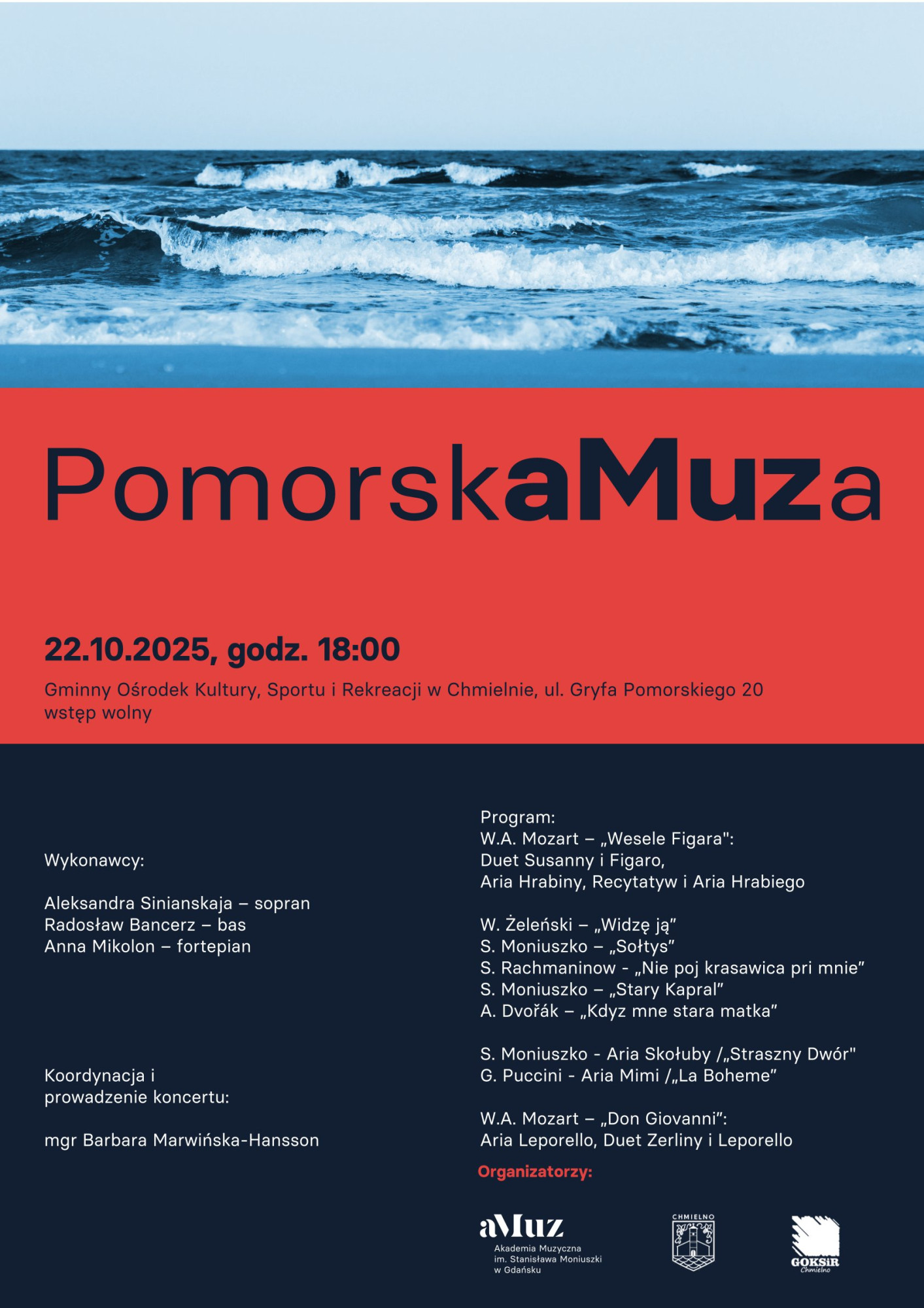 22 października 2025 r. (środa) o godz. 18:00 w Gminnym Ośrodku Kultury, Sportu i Rekreacji w Chmielnie odbędzie się koncert "PomorskaMuza".