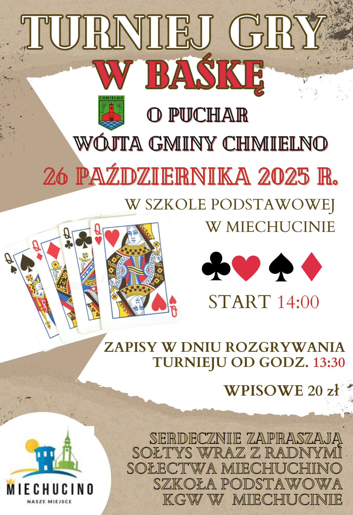 W niedzielę 26 października w Szkole Podstawowej w Miechucinie odbędzie się Turniej Gry w Baśkę o Puchar Wójta Gminy Chmielno. Zapisy prowadzone będą w dniu wydarzenia, od godz. 13:30.