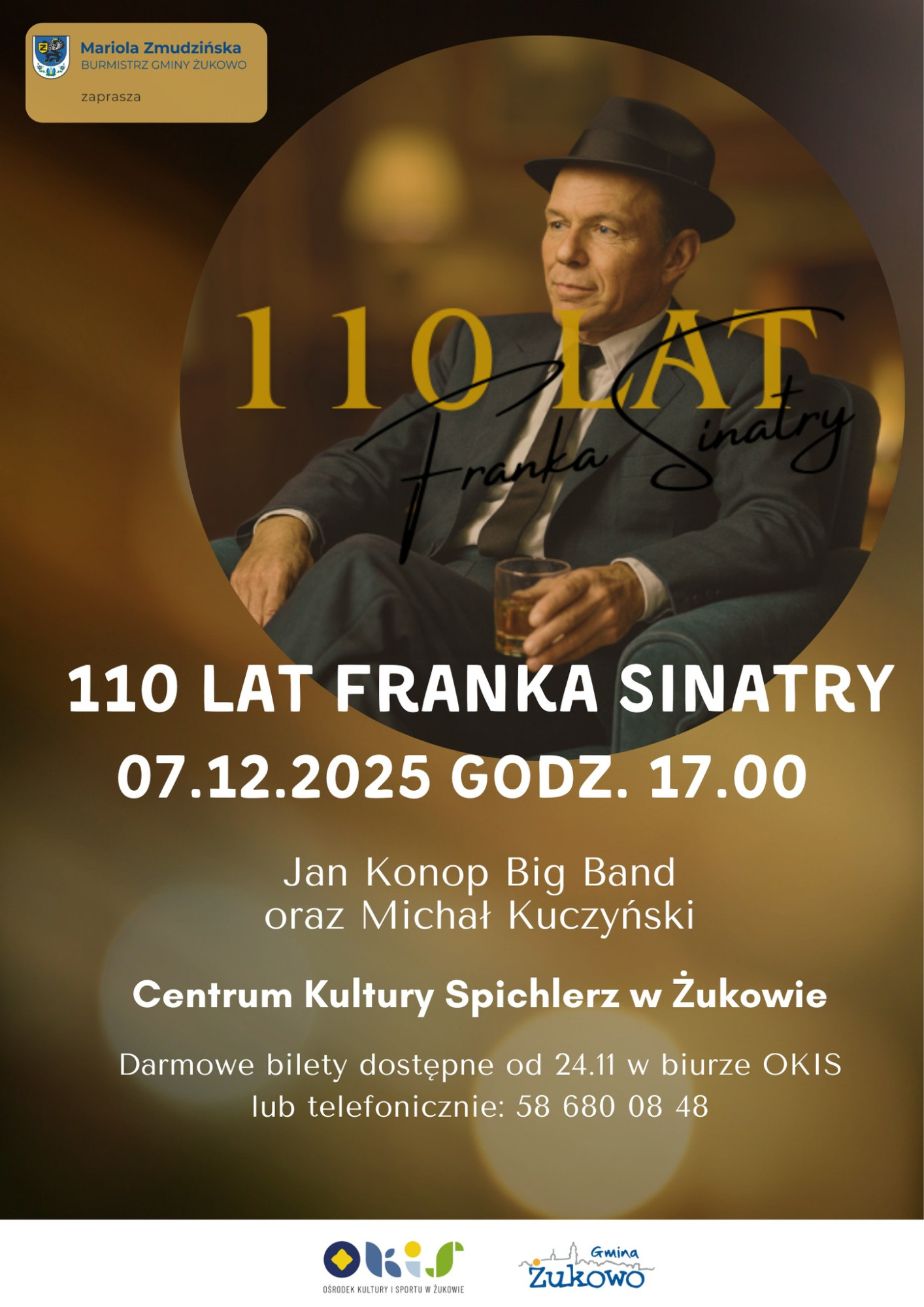 W niedzielę 7 grudnia o 17.00 w Centrum Kultury Spichlerz w Żukowie odbędzie się koncert z okazji 110. urodzin Franka Sinatry. Wystąpią Jan Konop Big Band oraz Michał Kuczyński. Darmowe bilety dostępne w biurze OKiS w Żukowie.
