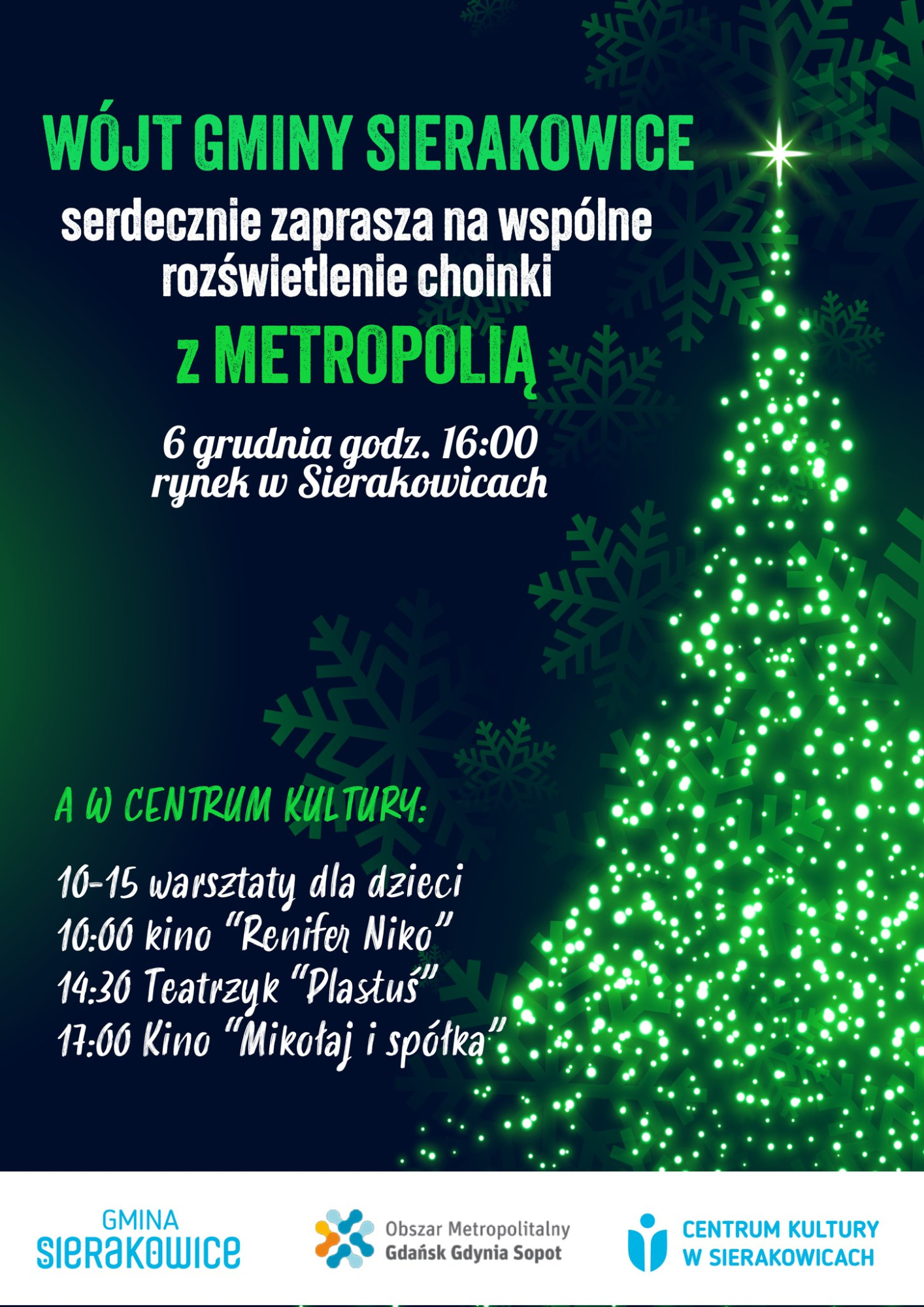 W sobotę 6 grudnia na rynku w Sierakowicach zaplanowano uroczyste rozświetlenie choinki. W tym roku podczas wydarzenia zagoszczą przedstawiciele Obszaru Metropolitalnego Gdańsk-Gdynia-Sopot.
