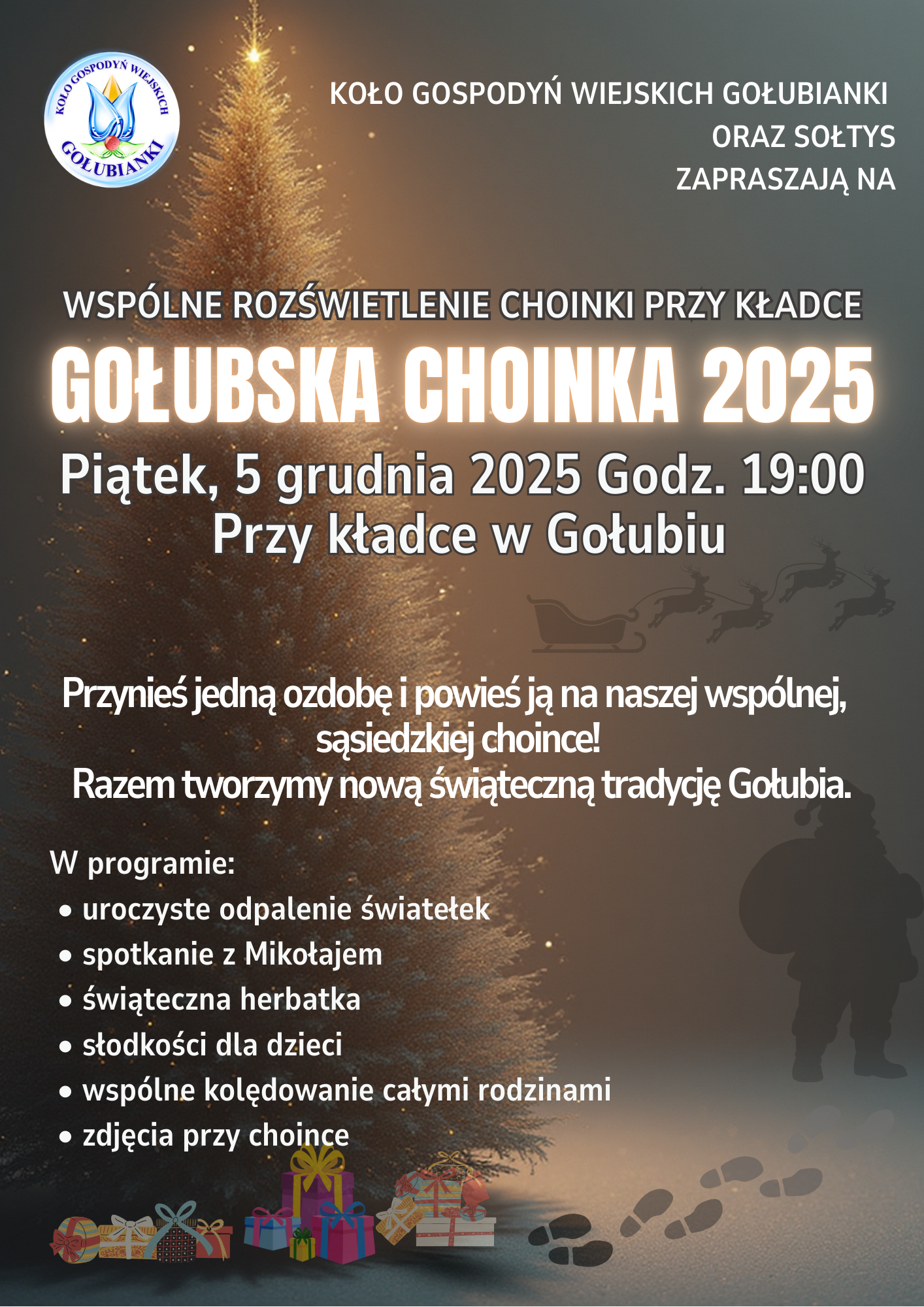 Koło Gospodyń Wiejskich Gołubianki wraz z sołtysem, radą sołecką i radnymi organizuje Gołubską Choinkę 2025 – pierwsze w historii miejscowości wspólne rozświetlenie świątecznego drzewka. Wydarzenie rozpocznie się o godz. 19.00 w piątek 5 grudnia przy kładce w Gołubiu.