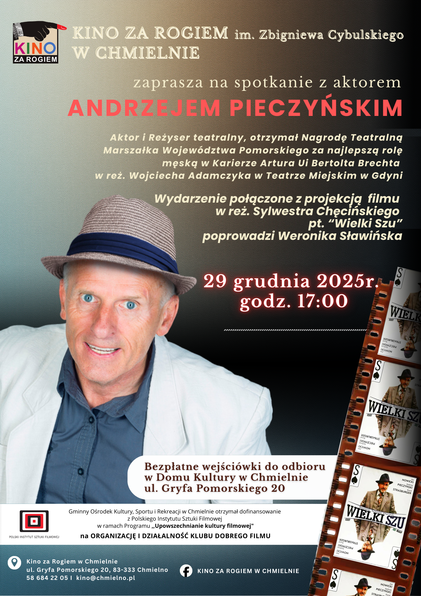 W poniedziałek 29 grudnia gościem Kina za Rogiem w Chmielnie będzie aktor Andrzej Pieczyński. Wstęp na wydarzenie możliwy jest dzięki darmowym wejściówkom - do odebrania w Domu Kultury w Chmielnie.