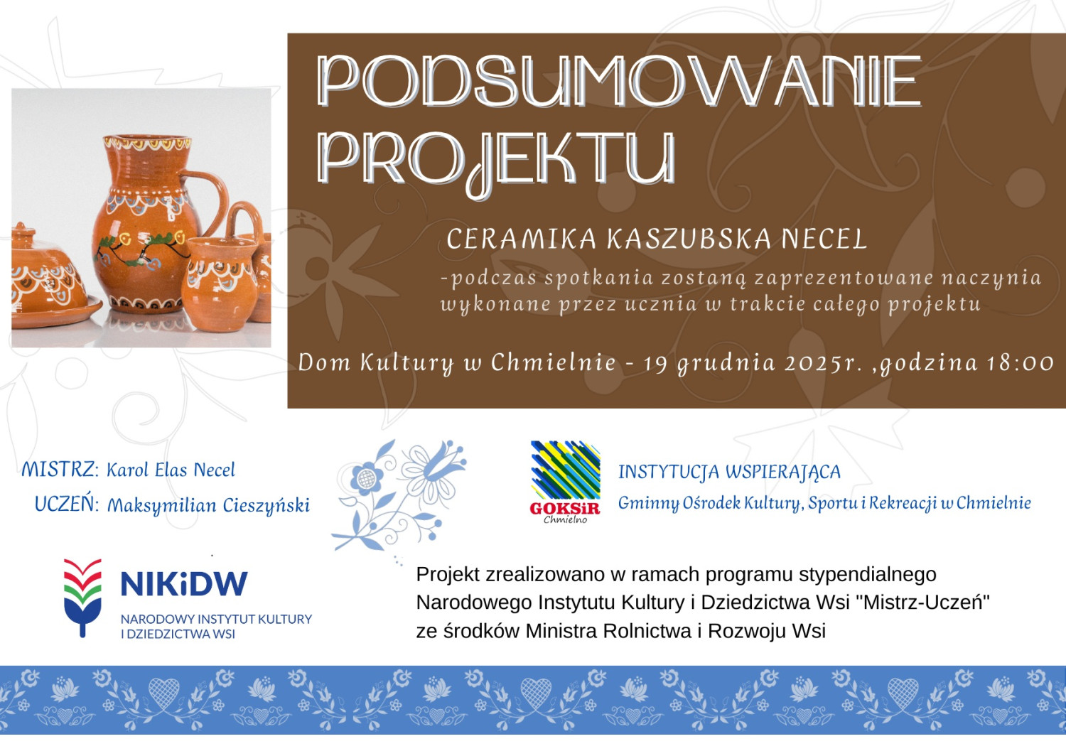 W piątek, 19 grudnia roku o godz. 18:00, w Domu Kultury w Chmielnie, odbędzie się spotkanie podsumowujące projekt realizowany w ramach programu stypendialnego "Mistrz i Uczeń" - Ceramika Kaszubska Necel. Wyświetlony zostanie też film o śp. Tadeuszu Makowskim.