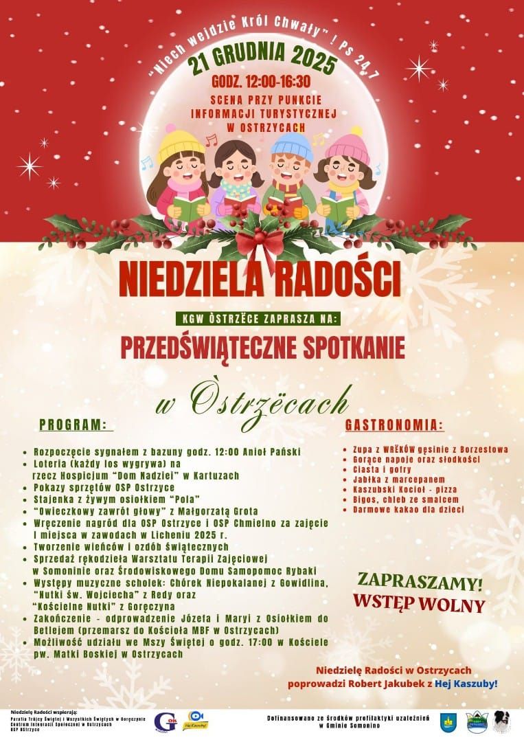 KGW Òstrzëce zaprasza na "Niedzielę Radości w Ostrzycach”, która odbędzie się 21 grudnia w godzinach 12:00-16:30 na scenie przy Punkcie Informacji Turystycznej w Ostrzycach. Wstęp na wydarzenie jest wolny.