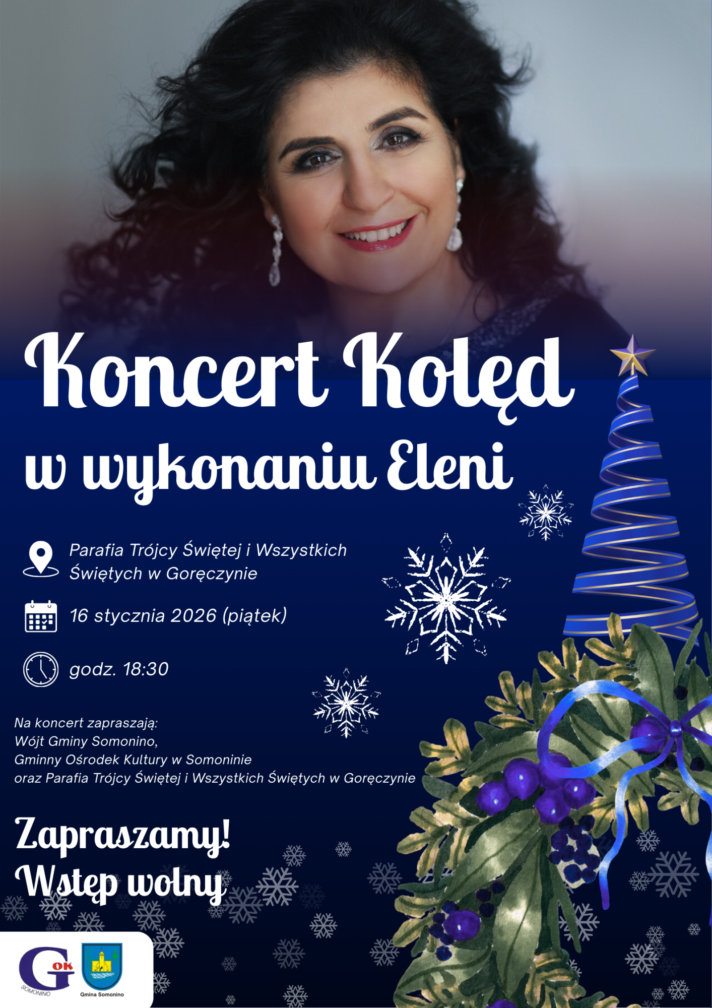 W piątek, 16 stycznia 2026 roku o godz. 18:30, w Parafii Trójcy Świętej i Wszystkich Świętych w Goręczynie odbędzie się koncert kolęd w wykonaniu Eleni - jednej z najbardziej znanych i cenionych polskich artystek.