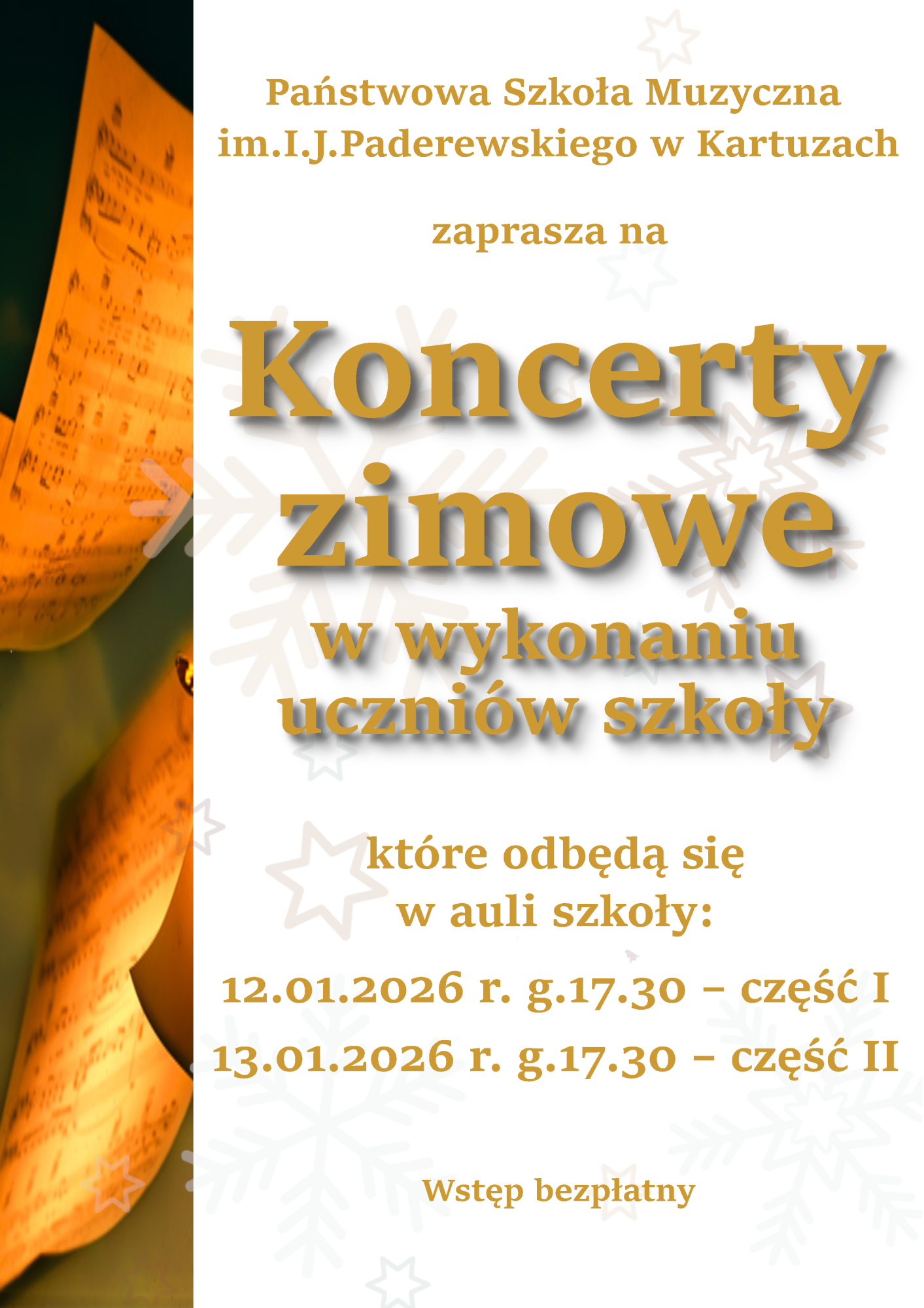 Koncerty zimowe w Szkole Muzycznej w Kartuzach są już tradycją. Tegoroczne odbędą się 12 (część I) i 13 stycznia (część II) o godz. 17.30 w auli placówki.