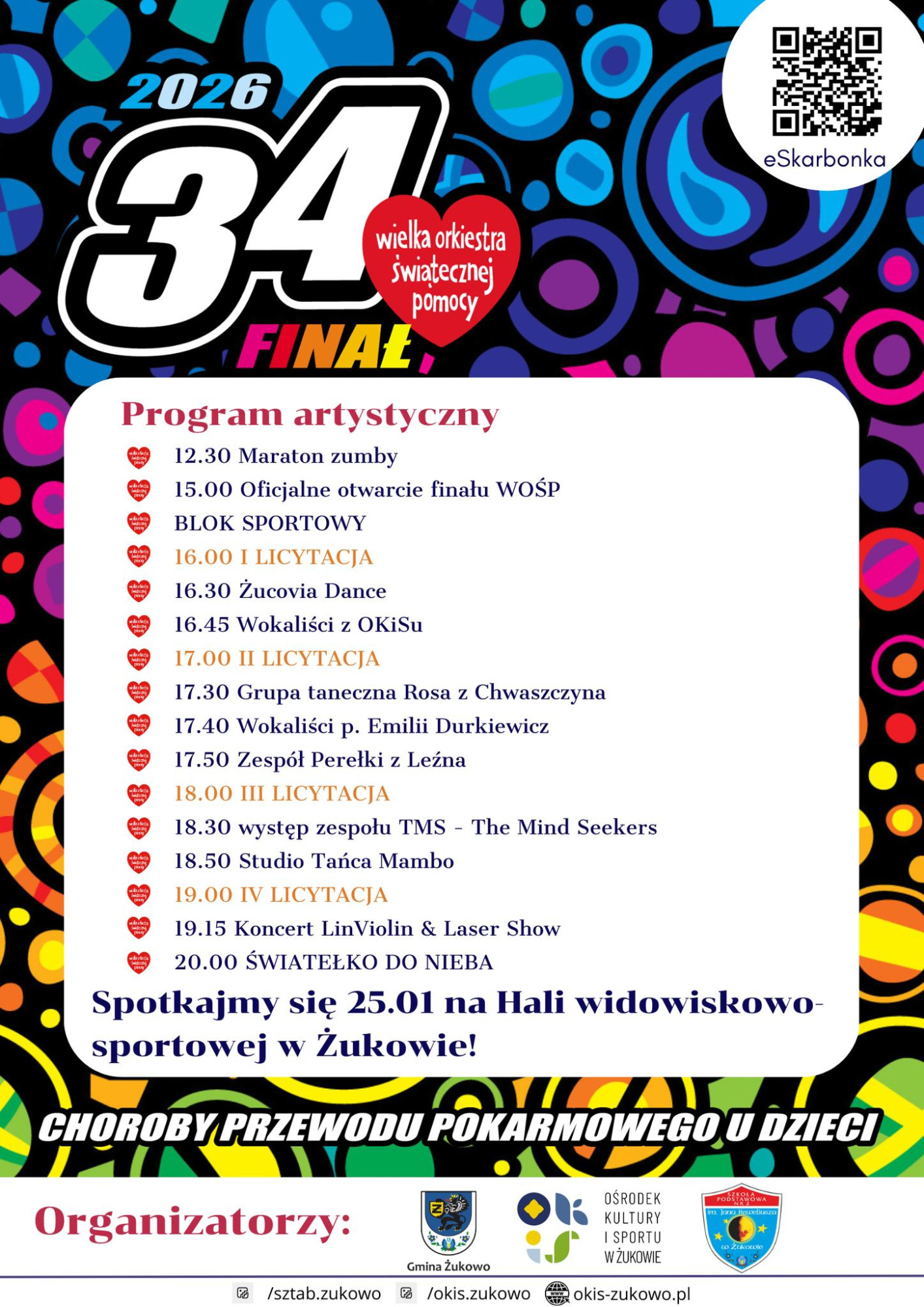 W hali widowiskowo-sportowej w Żukowie odbędzie się 34. Finał WOŚP, który połączy muzykę, taniec, sport i hojność mieszkańców. Tegoroczna zbiórka prowadzona będzie na rzecz dzieci z chorobami przewodu pokarmowego.