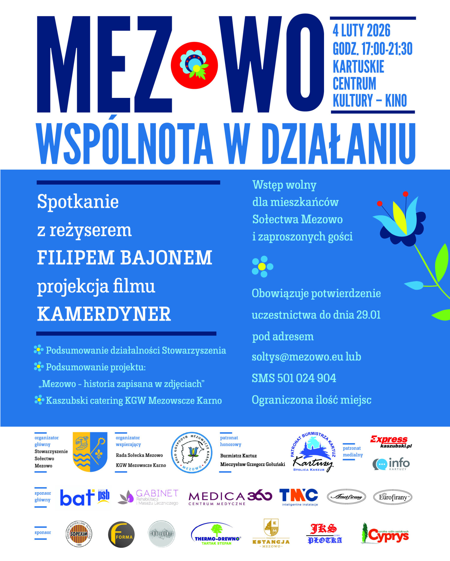 Stowarzyszenie Sołectwo Mezowo organizuje wydarzenia kulturalnego, które odbędzie się 4 lutego 2025 r. w Kartuskim Centrum Kultury "Mezowo – wspólnota w działaniu. Rok podsumowań i wspólnych historii".