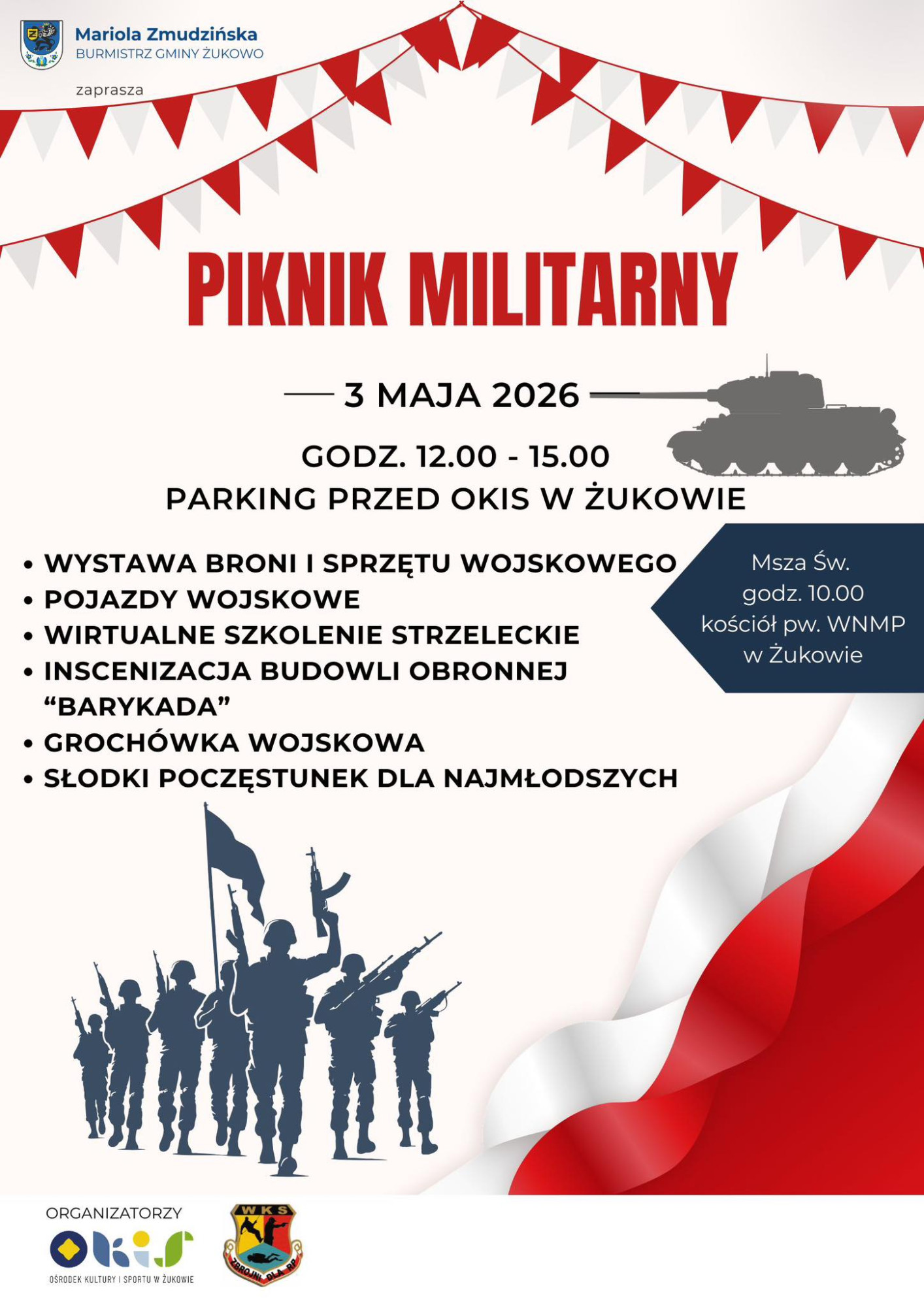 Wydarzenie rozpocznie się od mszy św. o godz. 10.00 w kościele pw. WNMP w Żukowie. Po niej nastąpi składanie kwiatów pod pomnikiem Matki Boskiej. Następnie o god. 12.00 na parkingu przy OKiS w Żukowie rusza Piknik Militarny.