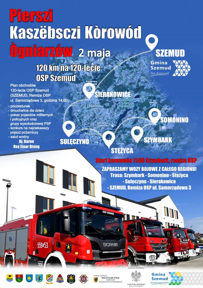 W sobotę 2 maja przez dwa powiaty przejedzie "Kaszëbsczi Kòrowód Ògniarzów", czyli strażacki korowód wozów bojowych z regionu. Organizowany jest z okazji 120-lecia OSP Szemud, a na trasie znajdą się m.in. Sierakowice, Somonino, Stężyca czy Sulęczyno.