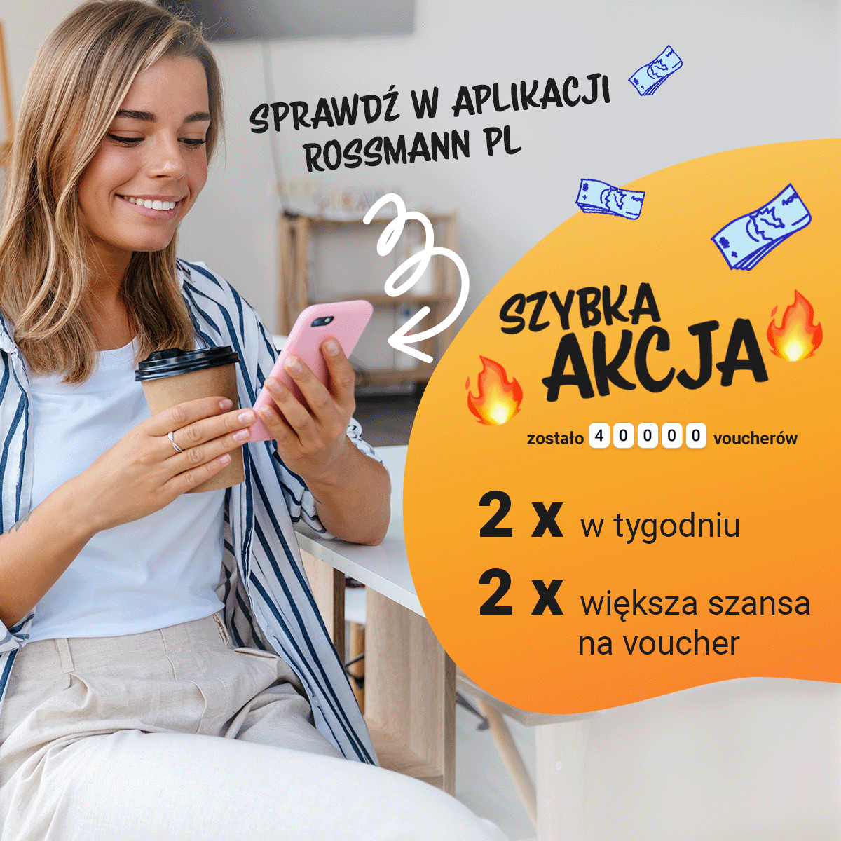 Od 4 maja zwiększamy częstotliwość „Szybkiej akcji”. W każdy poniedziałek i czwartek, w aplikacji Rossmann PL, można zdobyć voucher na zakup wybranego produktu w Rossmannie. Dzięki „Szybkiej akcji” zapłacisz od kilkunastu do kilkudziesięciu złotych mniej za jeden, konkretny, wskazany artykuł. Liczba voucherów jest limitowana – co tydzień będzie ich 80 tysięcy (po 40 tys. w każdy wskazany dzień). Mogą je otrzymać klienci, którzy są w Klubie Rossmann i jako pierwsi się po nie zgłoszą w aplikacji.