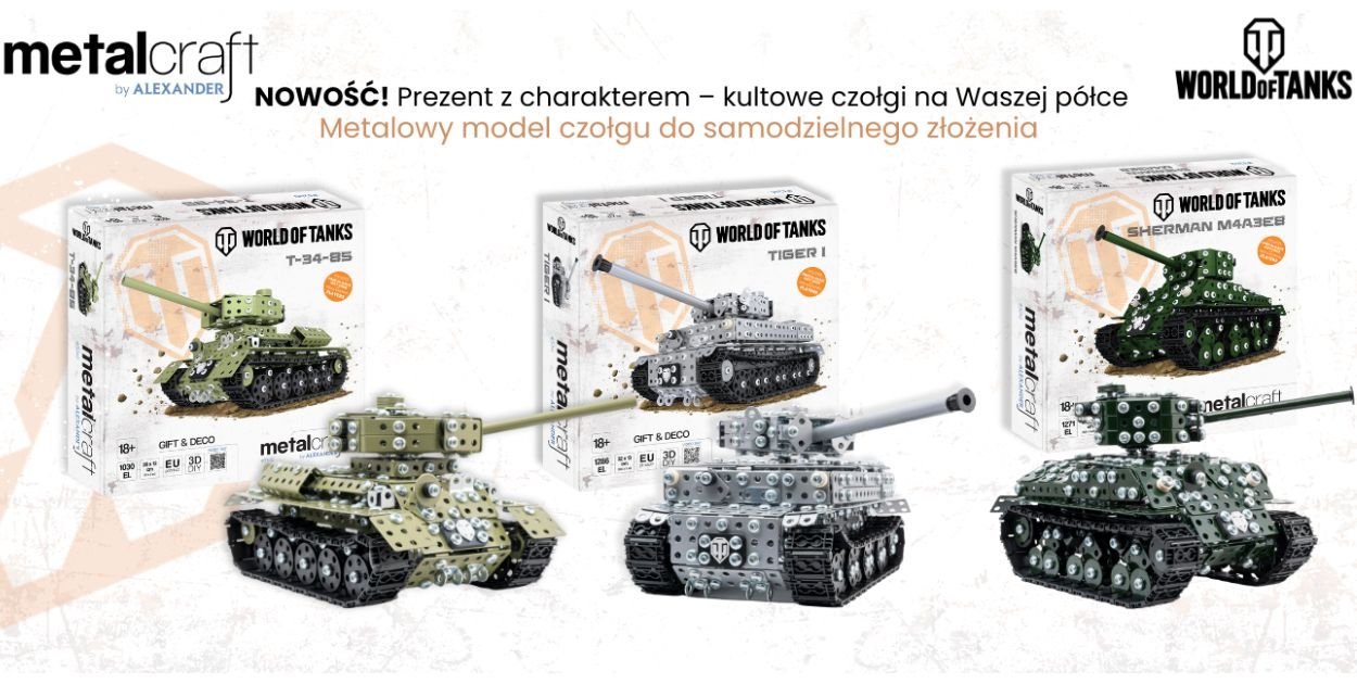 Drugą linię otwiera współpraca z Wargaming, twórcami World of Tanks. Tiger I, T-34-85 i Sherman M4A3E8 to ikony świata czołgów. Tutaj przybierają postać ciężkich, metalowych modeli z ruchomą wieżą, lufą i gąsienicami. Każdy zestaw składa się z około tysiąca elementów i wymaga skupienia, ale właśnie o to chodzi. O proces tworzenia, o zanurzenie się w detalu. O satysfakcję, gdy wkręca się ostatnią śrubkę. Dodatkowe kody podarunkowe do WoT sprawiają, że świat gry przenika się z tym, co stoi obok Twojego komputera.
