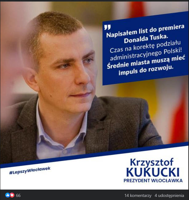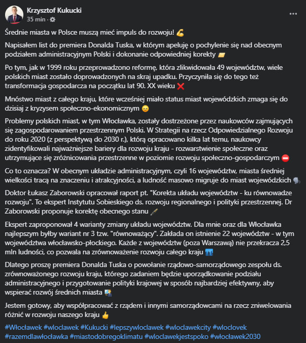Krzysztof Kukucki w swoim liście do premiera Tuska zaapelował o utworzenie zespołu, który zająłby się analizą i propozycjami dotyczącymi nowego podziału administracyjnego. Włocławski samorządowiec wyraził gotowość do współpracy, aby opracować strategię niwelującą różnice w rozwoju poszczególnych regionów Polski.