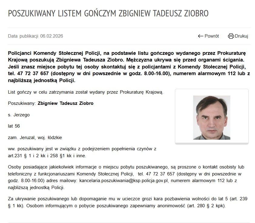 Prokuratura, która w piątek wydała list gończy za Ziobrą, a także planuje uruchomienie poszukiwań na podstawie europejskiego nakazu aresztowania (ENA), podała, że sąd uwzględnił w całości wniosek prokuratury o zastosowanie tymczasowego aresztowania wobec Ziobry.