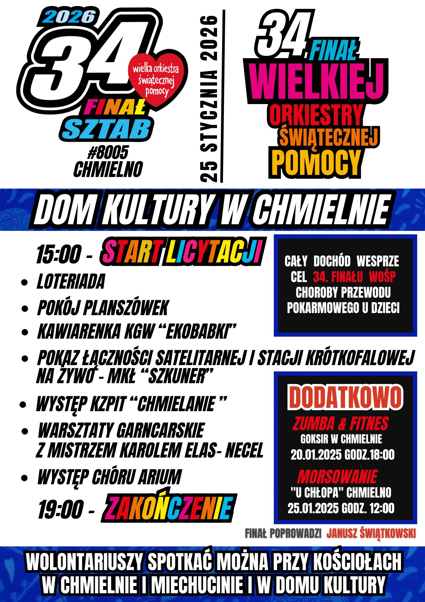 Niedziela 25 stycznia w Domu Kultury w Chmielnie przebiegnie pod znakiem radosnej atmosfery. Odbędzie się tu impreza z okazji 34. finału WOŚP.