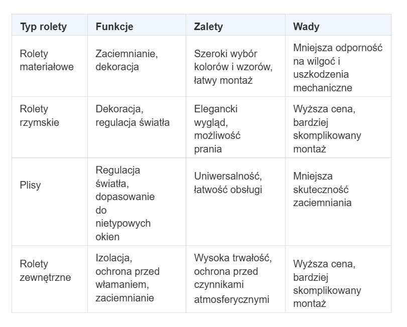 Poniższa tabela przedstawia porównanie różnych typów rolet, uwzględniając ich funkcje, zalety i wady: