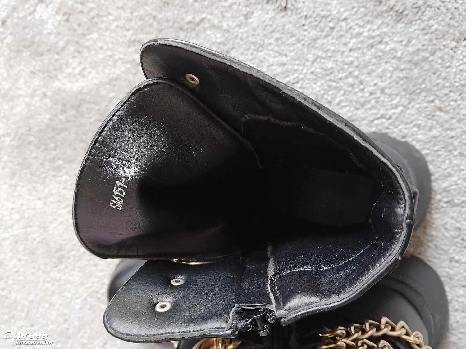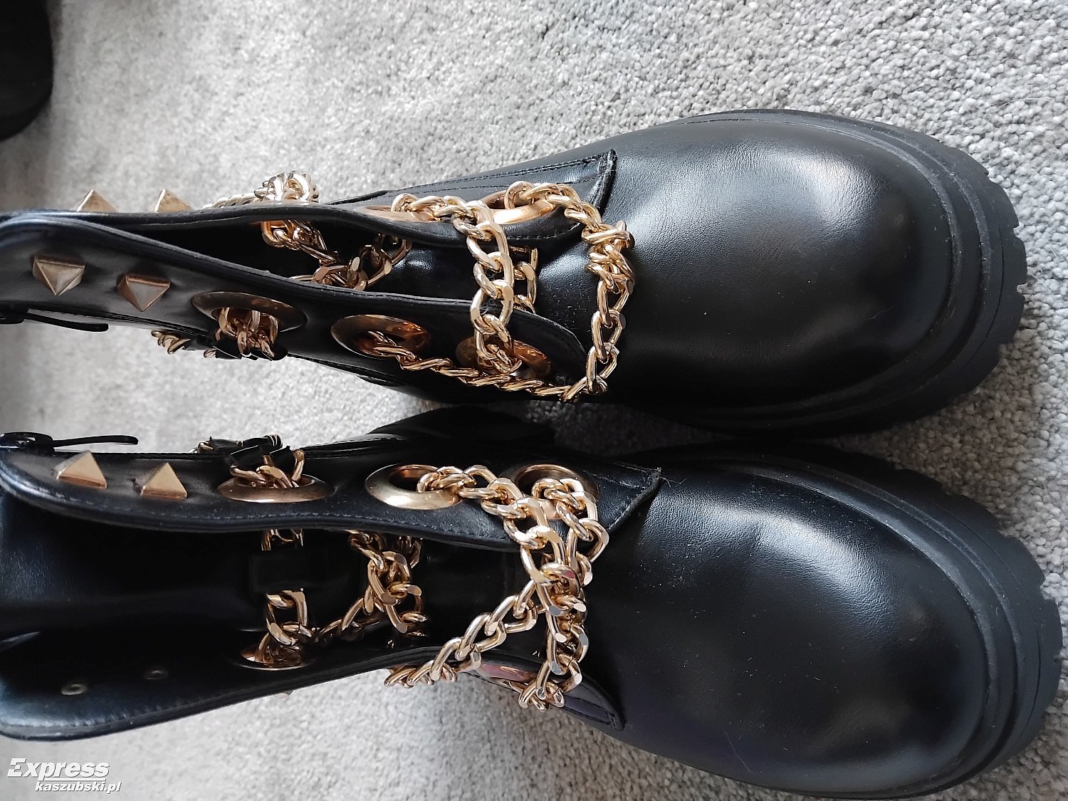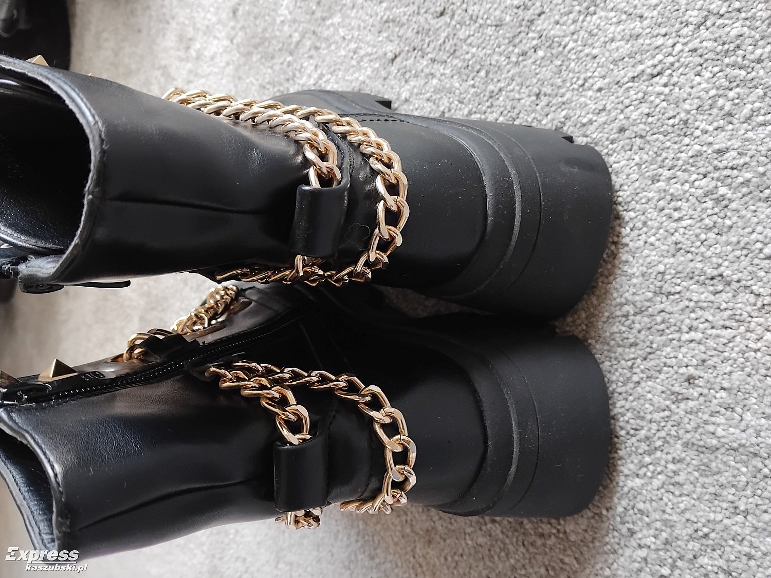 Sprzedam za polowe ceny nowe pieknie zdobione lancuchami i dodatkami w kolorze zlota czarne buty damskie,rozmiar 36.