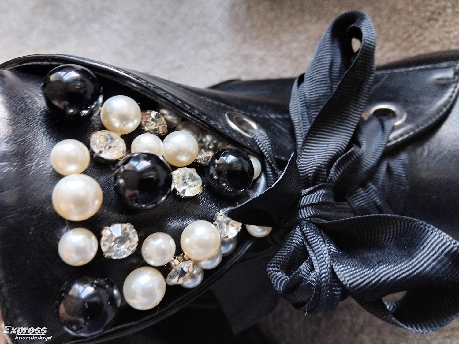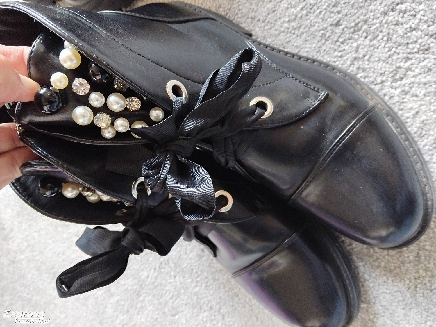 Na sprzedaz zadbane czarne sznurowane obuwie damskie,z boku na zamek,pieknie ozdobione perelkami,malo noszone,rozmiar 39.