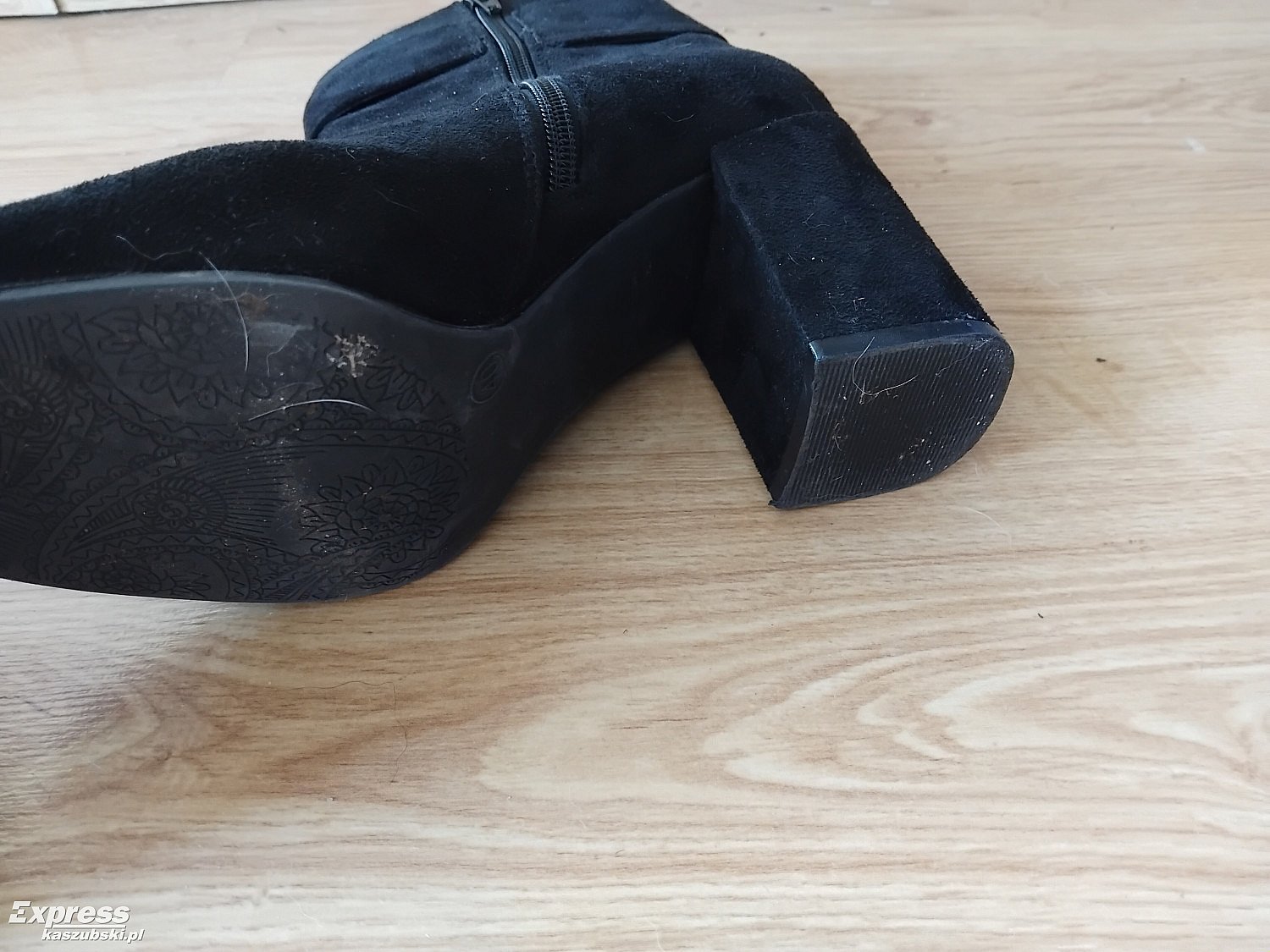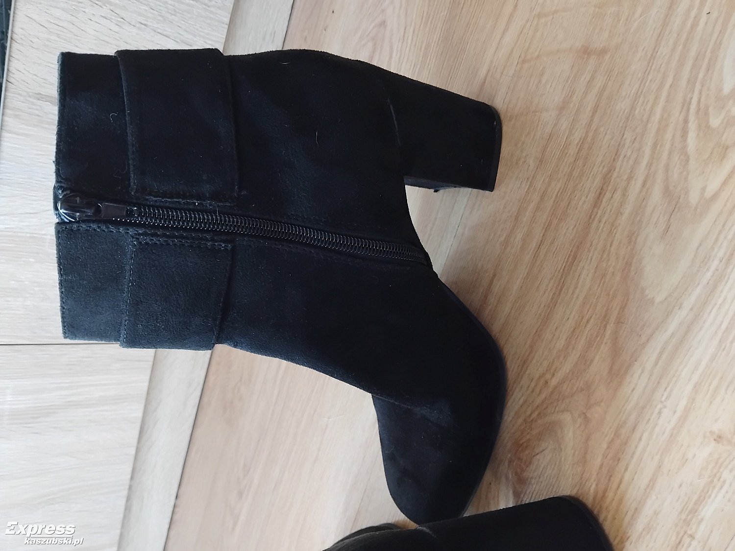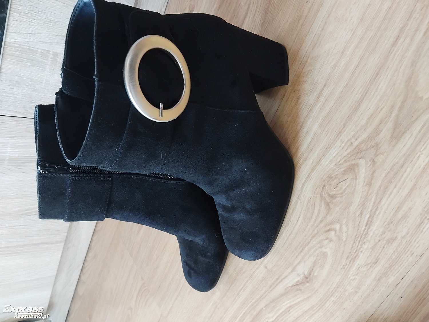 Piekne czarne zamszowe botki damskie ze zlota klamra na obcasie,z boku zamek. Czyste i zadbane,malo noszone,rozmiar 40.