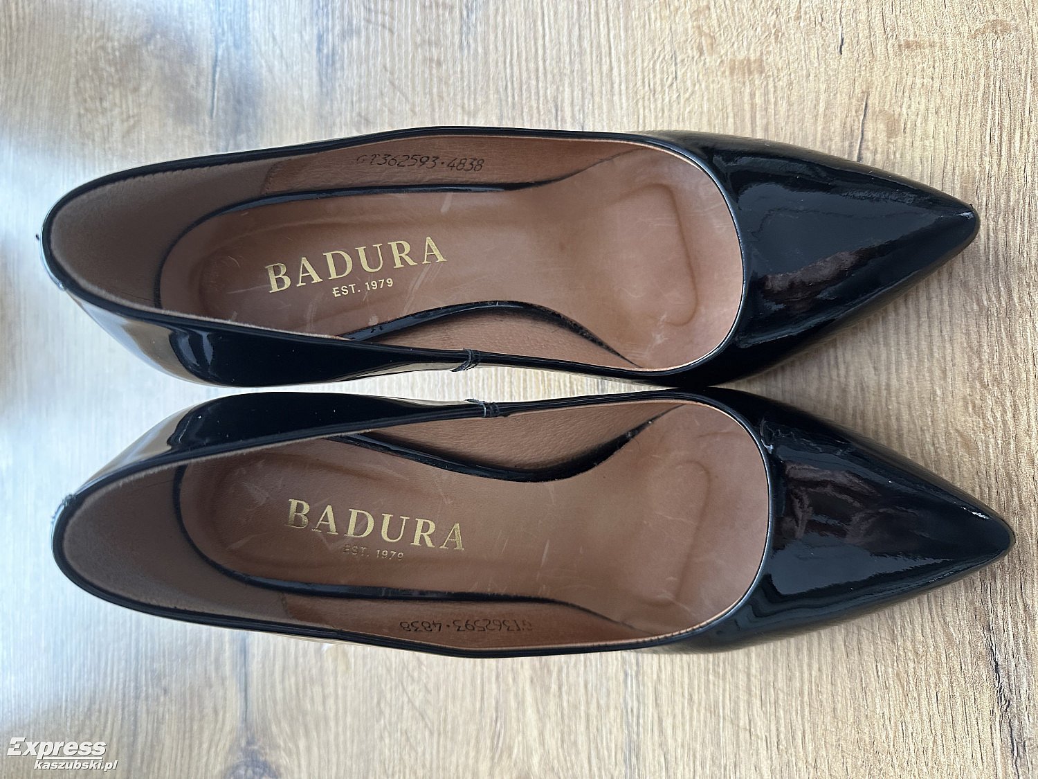 Sprzedam czarne, lakierowane szpilki skórzane firmy Badura w rozmiarze 36. Wysokość obcasa 9 cm. Widoczne ślady użytkowania. Odbiór osobisty w Żukowie. Cena 65 zł. Nr telefonu 508259078