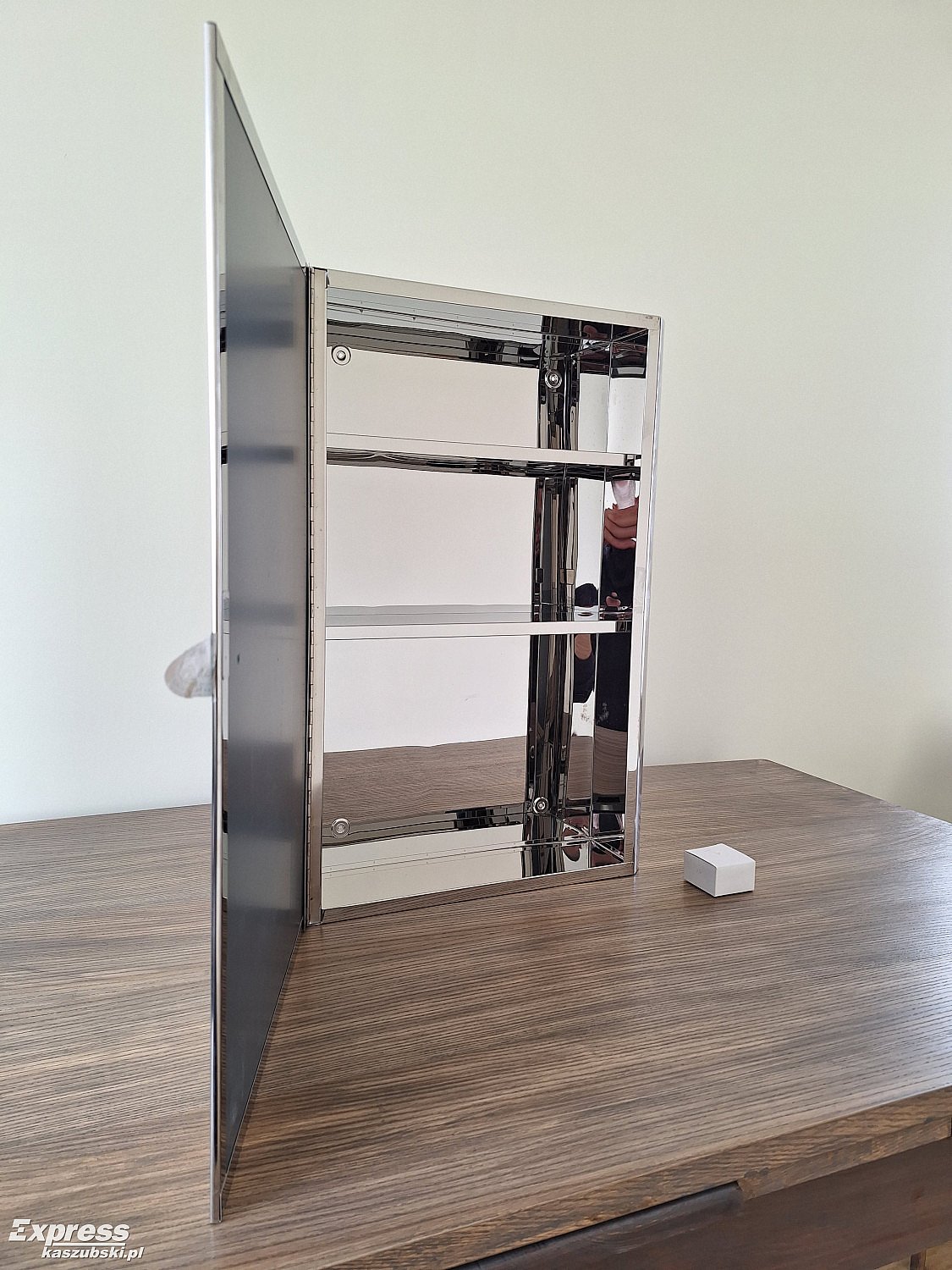 Sprzedam nową szafkę łazienkowa z lustrem. Możliwość innego zastosowania np. zaplecze firmy, schowek na apteczkę itd. Szafka wykonana ze stali nierdzewnej, posiada trzy wewnętrzne półki.