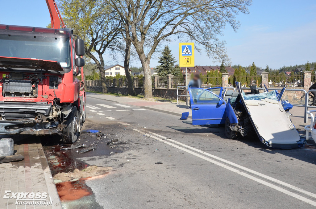 W centrum Stężycy doszło do zderzenia skody fabii z ciężarówką przewożącą beton.